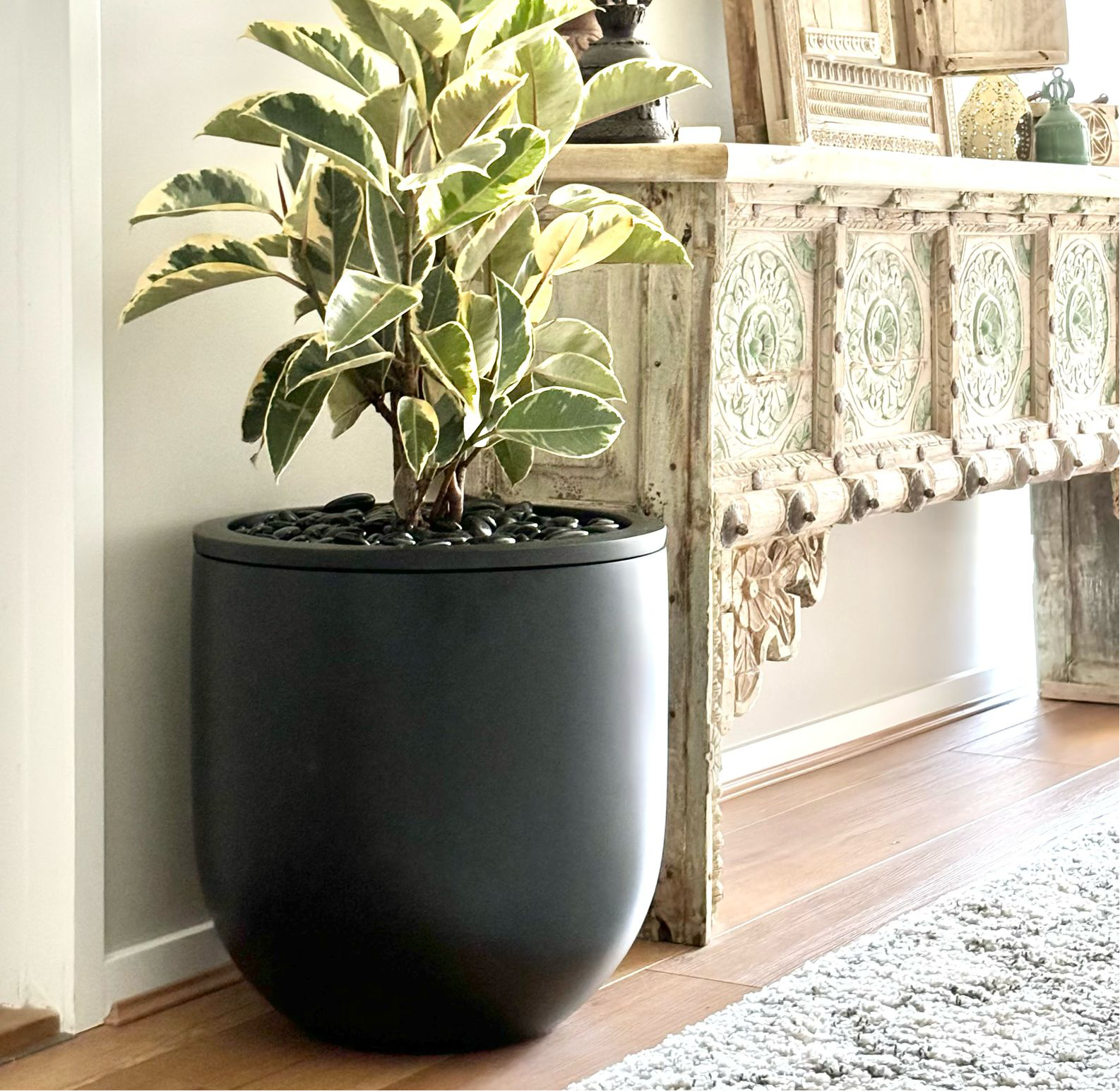 The Pot Top is a custom-designed, matching fiberglass ring that sits on top of your feature pot. It allows you to simply drop your plant still in its nursery pot straight into the central opening, raising the plant to the perfect height — no need to fill the pot with soil or stack awkward risers. Once in place, you can dress the surface with PolyPebbles or moss for a beautifully finished look. It's a cleaner, lighter, and more flexible way to style large pots, indoors or out.